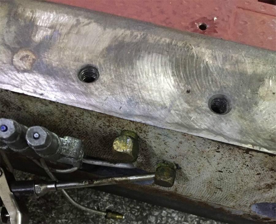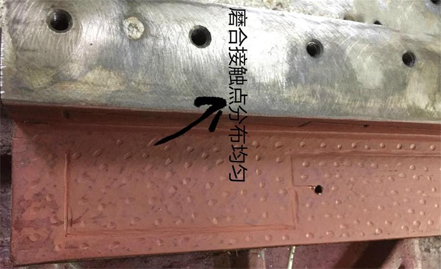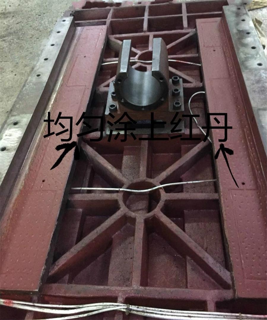 1、工作臺刮渣片全部拆掉,工作臺耐磨皮安裝面用氣槍吹干凈,汽油清洗干凈,均勻的涂上紅丹油。導軌面用汽油清洗干凈。