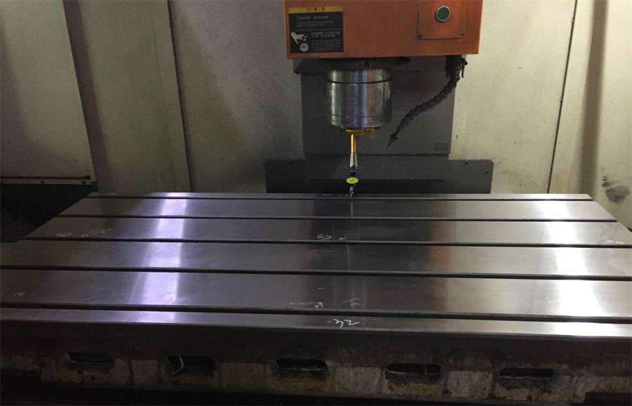 2、用行車把工作臺吊起翻轉(zhuǎn)過來,吊上機床,注意放到導軌上時不能壓碰到絲杠,放下后手拉工作臺靠緊基準面,用手輪搖X軸把絲杠傳動螺母鎖上2個螺絲,手輪來回移動X軸使磨合接觸點清晰。架上千分表,打工作臺九點平面度,記錄數(shù)據(jù)。