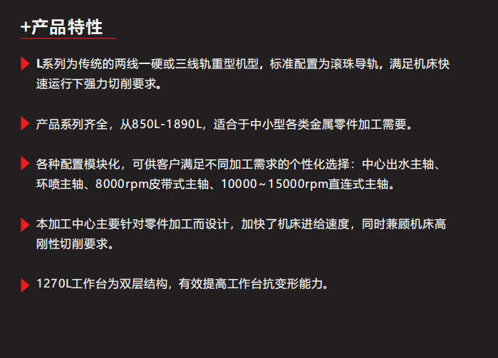 L系列整機(jī)以快速剛性加工為基本設(shè)計(jì)出發(fā)點(diǎn),為零部件量產(chǎn)、加工精度、加工效率最大化提供保證;高效排屑、快速進(jìn)給及主軸高速功能的組合模塊化,滿足客戶不同加工需求的個(gè)性化選擇;影響整機(jī)品質(zhì)的關(guān)鍵部件采用進(jìn)口優(yōu)質(zhì)配件。